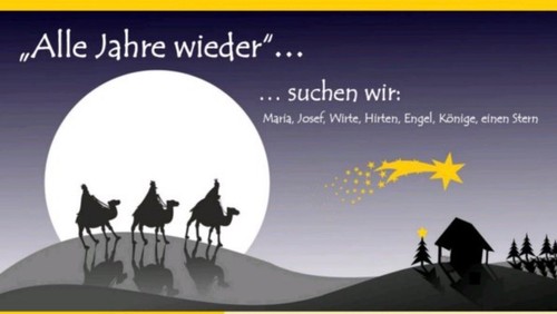 Wir suchen Kinder aller Konfessionen ab dem Kindergartenalter, die Freude am Mitspielen haben – ob mit oder ohne Text, für jede und jeden gibt es eine passende Rolle. Gesucht werden Maria, Josef, Wirte, Hirten, Engel, Könige und sogar ein Stern!