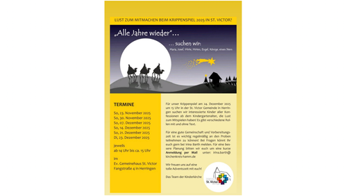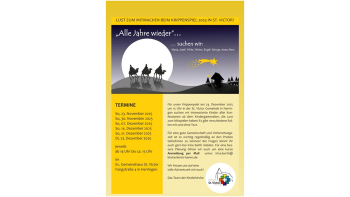 Das Krippenspiel wird dann am Heiligabend, 24. Dezember 2025, um 15:00 Uhr im Gemeindehaus St. Victor aufgeführt.