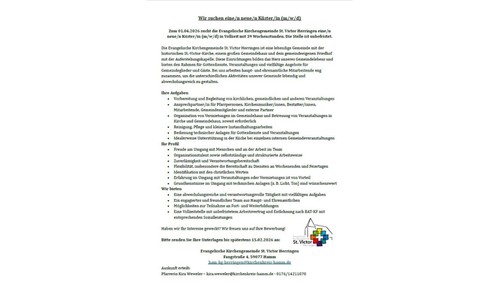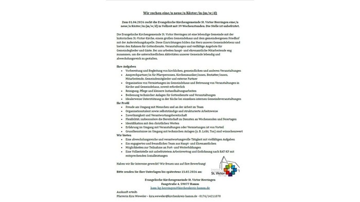 Zum 01.04.2026 sucht die Evangelische Kirchengemeinde St. Victor Herringen eine/n neue/n Küster/in (m/w/d) in Vollzeit mit 39 Wochenstunden. Die Stelle ist unbefristet.